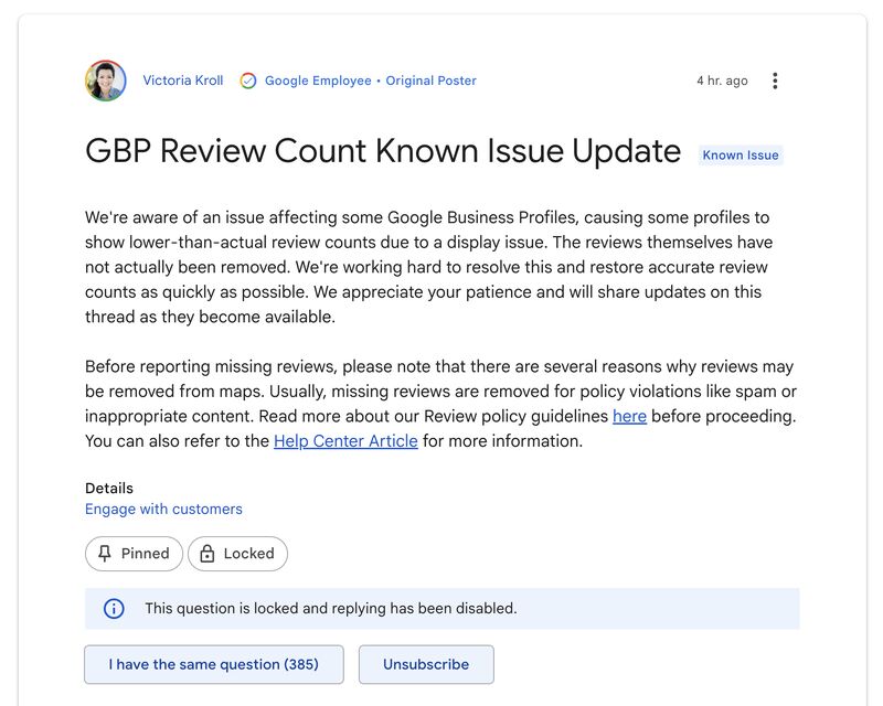 Tłumaczenie: “Aktualizacja dotycząca znanego problemu z liczbą recenzji w Google Business Profile